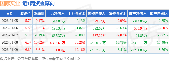 资金流向数据方面,本周国际实业主力资金合计净流入1.54亿元,游资资金合计净流出5173.37万元,散户资金合计净流出1.03亿元。本周资金流向一览见下表: