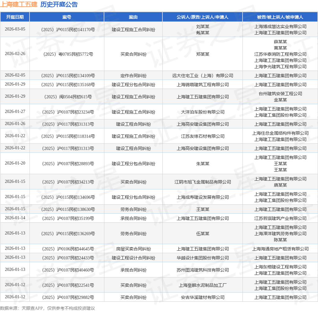 证券之星消息,根据天眼查APP显示,近日公布了一则上海建工五建集团有限公司作为被告/被上诉人的开庭公告,详细内容如下: