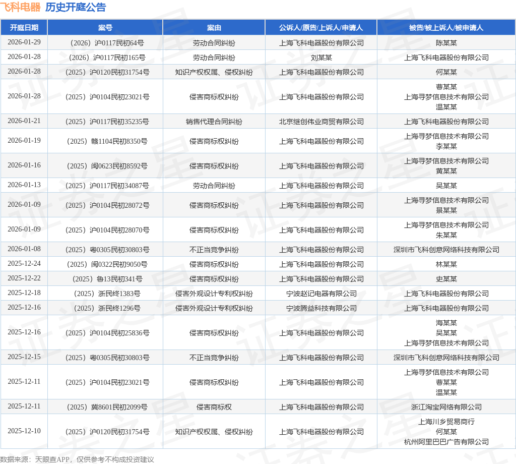 案号:(2025)沪0117民初34087号根据统计,近一年内以上海飞科电器股份有限公司为当事人的历史开庭公告有227则,其中案由为“侵害商标权纠纷”的公告以171则居首,其次为“不正当竞争纠纷”有15则,“侵害外观设计专利权纠纷”有11则。历史开庭公告(前20条)如下: