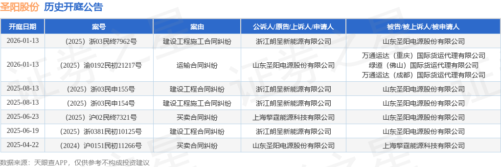 案号:(2025)浙03民终7962号根据统计,近一年内以山东圣阳电源股份有限公司为当事人的历史开庭公告有7则,其中案由为“买卖合同纠纷”的公告以2则居首,其次为“建设工程合同纠纷”有2则,“建设工程施工合同纠纷”有2则。历史开庭公告如下: