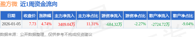 资金流向数据方面,本周盈方微主力资金合计净流入3409.04万元,游资资金合计净流出684.32万元,散户资金合计净流出2724.72万元。本周资金流向一览见下表: