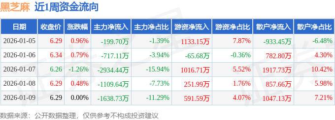 资金流向数据方面,本周黑芝麻主力资金合计净流出6599.63万元,游资资金合计净流入2927.76万元,散户资金合计净流入3671.87万元。本周资金流向一览见下表: