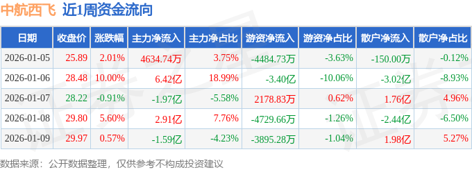 资金流向数据方面,本周中航西飞主力资金合计净流入6.23亿元,游资资金合计净流出4.49亿元,散户资金合计净流出1.74亿元。本周资金流向一览见下表: