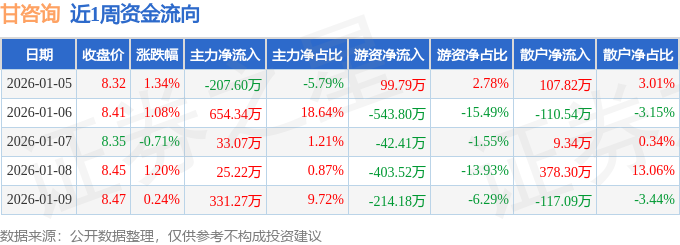 资金流向数据方面,本周甘咨询主力资金合计净流入836.3万元,游资资金合计净流出1104.13万元,散户资金合计净流入267.83万元。本周资金流向一览见下表:
