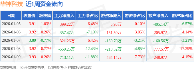资金流向数据方面,本周华神科技主力资金合计净流出909.36万元,游资资金合计净流入242.55万元,散户资金合计净流入666.8万元。本周资金流向一览见下表: