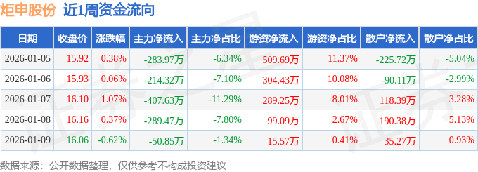 资金流向数据方面,本周炬申股份主力资金合计净流出1246.24万元,游资资金合计净流入1218.04万元,散户资金合计净流入28.2万元。本周资金流向一览见下表: