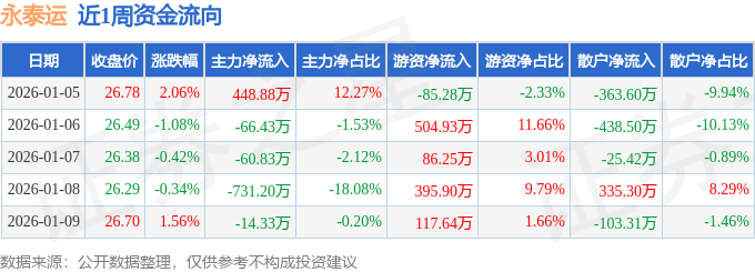 资金流向数据方面,本周永泰运主力资金合计净流出423.91万元,游资资金合计净流入1019.44万元,散户资金合计净流出595.53万元。本周资金流向一览见下表: