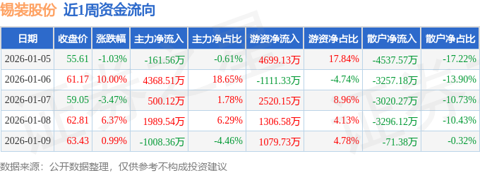 资金流向数据方面,本周锡装股份主力资金合计净流入5688.25万元,游资资金合计净流入8494.27万元,散户资金合计净流出1.42亿元。本周资金流向一览见下表:
