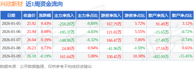 资金流向数据方面,本周兴欣新材主力资金合计净流出327.18万元,游资资金合计净流入743.77万元,散户资金合计净流出416.58万元。本周资金流向一览见下表: