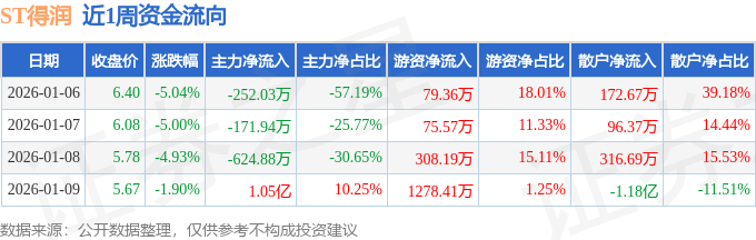 资金流向数据方面,本周ST得润主力资金合计净流入9423.81万元,游资资金合计净流入1741.54万元,散户资金合计净流出1.12亿元。本周资金流向一览见下表: