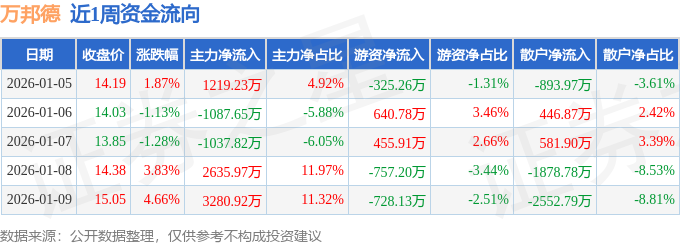 资金流向数据方面,本周万邦德主力资金合计净流入5010.66万元,游资资金合计净流出713.88万元,散户资金合计净流出4296.77万元。本周资金流向一览见下表: