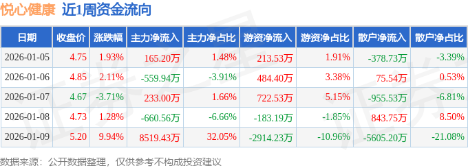 资金流向数据方面,本周悦心健康主力资金合计净流入7697.13万元,游资资金合计净流出1676.96万元,散户资金合计净流出6020.17万元。本周资金流向一览见下表:
