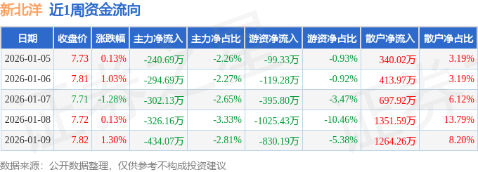 资金流向数据方面,本周新北洋主力资金合计净流出1597.74万元,游资资金合计净流出2470.02万元,散户资金合计净流入4067.76万元。本周资金流向一览见下表: