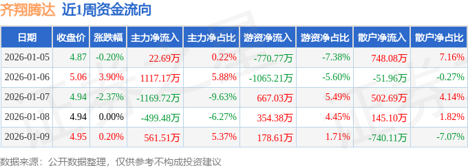 资金流向数据方面,本周齐翔腾达主力资金合计净流入32.17万元,游资资金合计净流出635.96万元,散户资金合计净流入603.79万元。本周资金流向一览见下表: