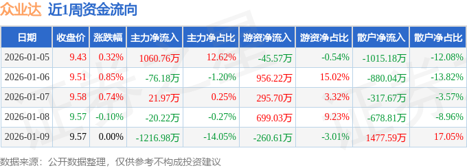 沪深股通持股方面,截止2026年1月9日收盘,众业达深股通持股数为197.68万股,占流通股比为50.0%。