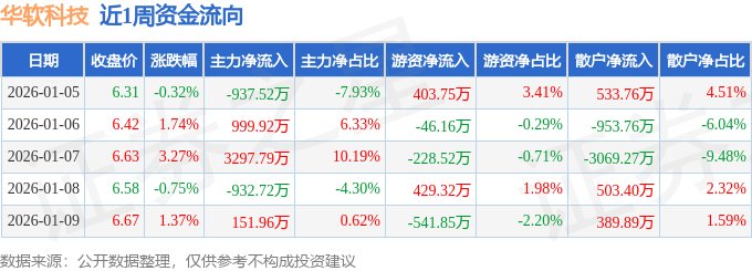 沪深股通持股方面,截止2026年1月9日收盘,华软科技深股通持股数为1241.67万股,占流通股比为203.0%。