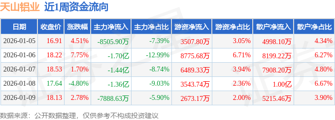 资金流向数据方面,本周天山铝业主力资金合计净流出6.13亿元,游资资金合计净流入2.5亿元,散户资金合计净流入3.64亿元。本周资金流向一览见下表: