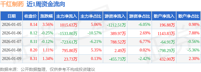 资金流向数据方面,本周千红制药主力资金合计净流出422.26万元,游资资金合计净流出487.25万元,散户资金合计净流入909.52万元。本周资金流向一览见下表: