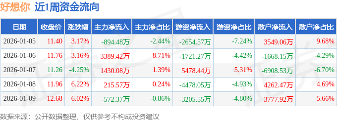 资金流向数据方面,本周好想你主力资金合计净流入3568.23万元,游资资金合计净流出6581.0万元,散户资金合计净流入3012.78万元。本周资金流向一览见下表: