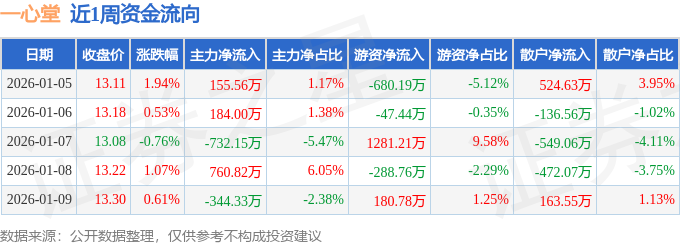 资金流向数据方面,本周一心堂主力资金合计净流入23.9万元,游资资金合计净流入445.61万元,散户资金合计净流出469.5万元。本周资金流向一览见下表: