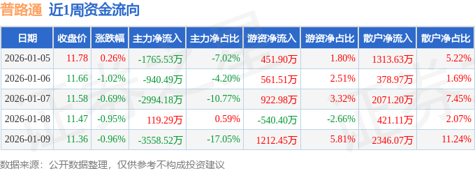 资金流向数据方面,本周普路通主力资金合计净流出9139.42万元,游资资金合计净流入2608.44万元,散户资金合计净流入6530.98万元。本周资金流向一览见下表: