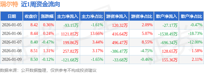 资金流向数据方面,本周瑞尔特主力资金合计净流入1364.71万元,游资资金合计净流入613.28万元,散户资金合计净流出1977.99万元。本周资金流向一览见下表: