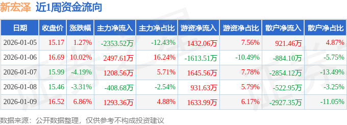 资金流向数据方面,本周新宏泽主力资金合计净流入2237.33万元,游资资金合计净流入4029.72万元,散户资金合计净流出6267.06万元。本周资金流向一览见下表: