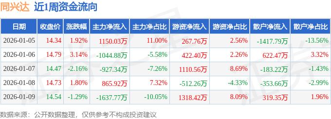 资金流向数据方面,本周同兴达主力资金合计净流出1594.03万元,游资资金合计净流入2606.88万元,散户资金合计净流出1012.85万元。本周资金流向一览见下表: