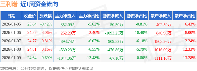 资金流向数据方面,本周三利谱主力资金合计净流出2576.83万元,游资资金合计净流出2597.23万元,散户资金合计净流入5174.07万元。本周资金流向一览见下表: