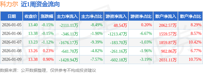资金流向数据方面,本周科力尔主力资金合计净流出6204.02万元,游资资金合计净流出2211.96万元,散户资金合计净流入8415.98万元。本周资金流向一览见下表: