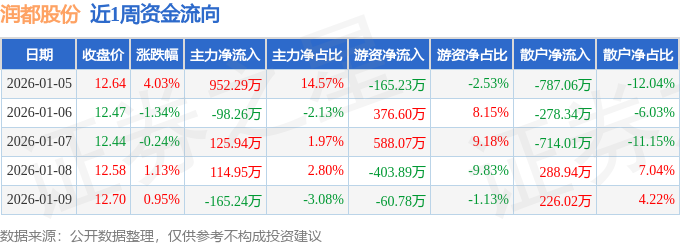 资金流向数据方面,本周润都股份主力资金合计净流入929.69万元,游资资金合计净流入334.76万元,散户资金合计净流出1264.45万元。本周资金流向一览见下表: