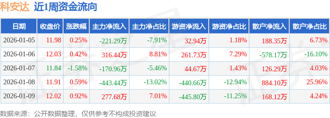 资金流向数据方面,本周科安达主力资金合计净流出241.58万元,游资资金合计净流出547.12万元,散户资金合计净流入788.7万元。本周资金流向一览见下表: