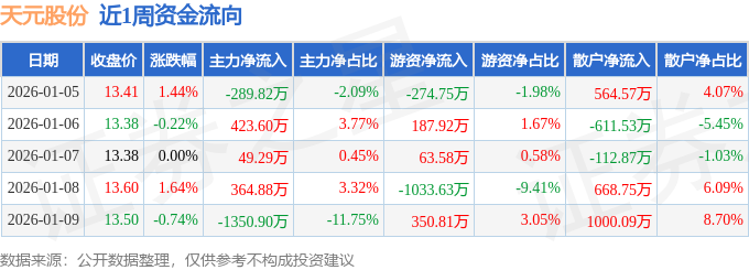 资金流向数据方面,本周天元股份主力资金合计净流出802.94万元,游资资金合计净流出706.07万元,散户资金合计净流入1509.01万元。本周资金流向一览见下表: