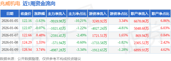 资金流向数据方面,本周兆威机电主力资金合计净流出1.91亿元,游资资金合计净流出2702.04万元,散户资金合计净流入2.18亿元。本周资金流向一览见下表: