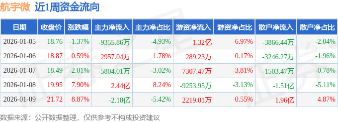 资金流向数据方面,本周航宇微主力资金合计净流出9615.65万元,游资资金合计净流入1.38亿元,散户资金合计净流出4168.41万元。本周资金流向一览见下表: