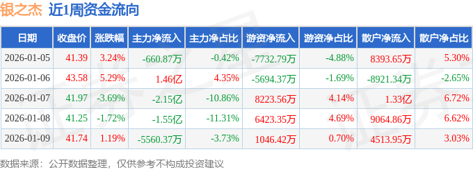 资金流向数据方面,本周银之杰主力资金合计净流出2.86亿元,游资资金合计净流入2266.16万元,散户资金合计净流入2.64亿元。本周资金流向一览见下表:
