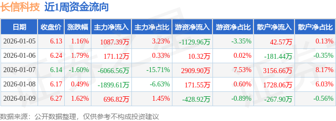 资金流向数据方面,本周长信科技主力资金合计净流出6010.85万元,游资资金合计净流入1532.89万元,散户资金合计净流入4477.96万元。本周资金流向一览见下表: