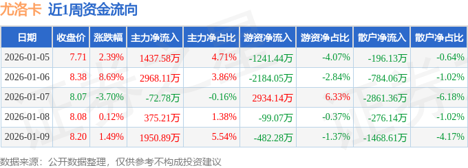 资金流向数据方面,本周尤洛卡主力资金合计净流入6659.0万元,游资资金合计净流出1072.7万元,散户资金合计净流出5586.3万元。本周资金流向一览见下表: