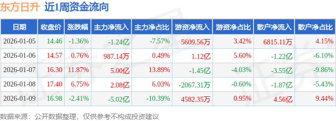 资金流向数据方面,本周东方日升主力资金合计净流入9125.34万元,游资资金合计净流入4818.39万元,散户资金合计净流出1.39亿元。本周资金流向一览见下表: