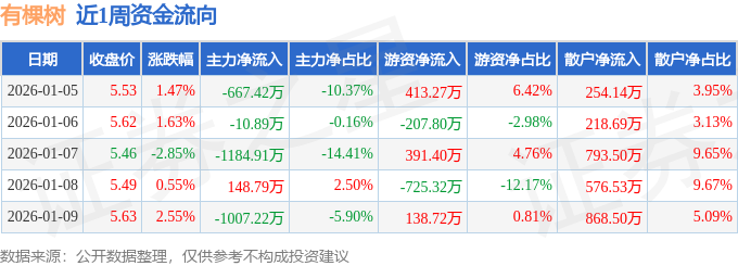 资金流向数据方面,本周有棵树主力资金合计净流出2721.65万元,游资资金合计净流入10.28万元,散户资金合计净流入2711.36万元。本周资金流向一览见下表: