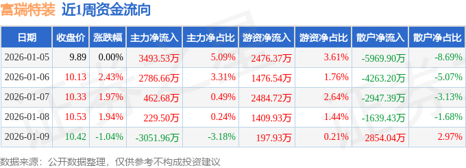 资金流向数据方面,本周富瑞特装主力资金合计净流入3920.4万元,游资资金合计净流入8045.48万元,散户资金合计净流出1.2亿元。本周资金流向一览见下表: