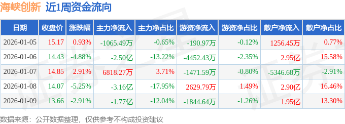 资金流向数据方面,本周海峡创新主力资金合计净流出6.86亿元,游资资金合计净流出5329.84万元,散户资金合计净流入7.39亿元。本周资金流向一览见下表: