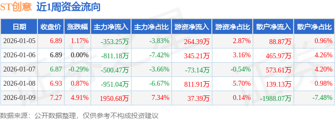 资金流向数据方面,本周ST创意主力资金合计净流出665.27万元,游资资金合计净流入1385.75万元,散户资金合计净流出720.48万元。本周资金流向一览见下表: