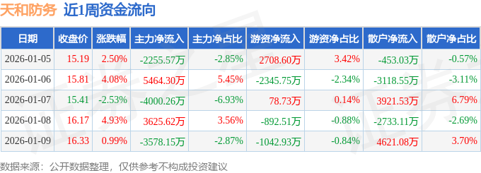 资金流向数据方面,本周天和防务主力资金合计净流出744.06万元,游资资金合计净流出1493.86万元,散户资金合计净流入2237.92万元。本周资金流向一览见下表: