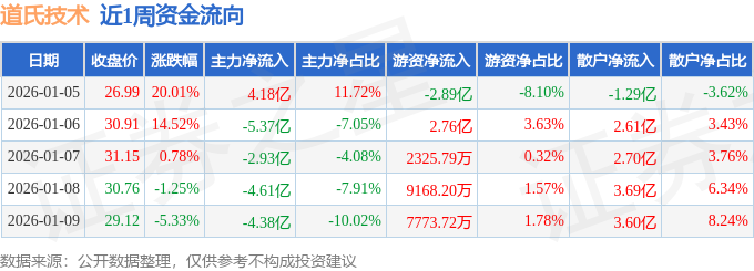 资金流向数据方面,本周道氏技术主力资金合计净流出13.11亿元,游资资金合计净流入1.8亿元,散户资金合计净流入11.31亿元。本周资金流向一览见下表: