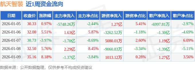 资金流向数据方面,本周航天智装主力资金合计净流入2822.02万元,游资资金合计净流入6515.85万元,散户资金合计净流出9337.87万元。本周资金流向一览见下表: