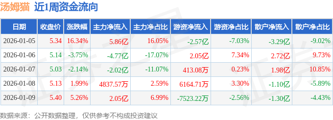 资金流向数据方面,本周汤姆猫主力资金合计净流入1.61亿元,游资资金合计净流出6110.9万元,散户资金合计净流出9950.69万元。本周资金流向一览见下表: