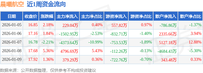 沪深股通持股方面,截止2026年1月9日收盘,晨曦航空深股通持股数为88.27万股,占流通股比为16.0%。