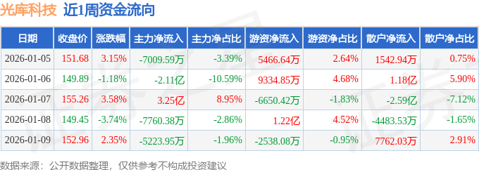 资金流向数据方面,本周光库科技主力资金合计净流出8583.52万元,游资资金合计净流入1.79亿元,散户资金合计净流出9273.38万元。本周资金流向一览见下表:
