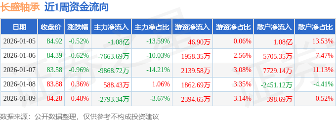 资金流向数据方面,本周长盛轴承主力资金合计净流出3.06亿元,游资资金合计净流入8402.17万元,散户资金合计净流入2.22亿元。本周资金流向一览见下表:
